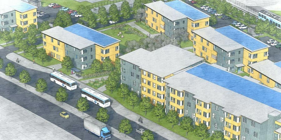 The project includes 131 affordable housing units, including 33 supportive housing units, within multiple three and four story buildings on approximately 5.29 acres of the larger 6.5 acre parcel. The units will be targeted as rentals to families earning between 20% and 60% of AMI. On-site management offices, supportive housing support services, and resident community space/amenities will be located on the ground floor of one building. A small retail coffee shop will be located on the ground floor of one building. Tenant amenities also include community garden, dog run, playground, tot lot, and basketball court. The proposal includes 153 on-site vehicular parking spaces. Access to the site is from North McDowell.